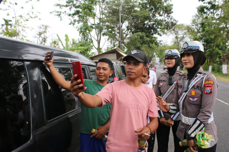 Pasalnya, banyak warga yang justru minta foto bareng dengan Polwan cantik dari Satuan Lalu Lintas Polres Bondowoso Polda Jatim yang hadir berbagi minuman gratis untuk warga yang antri BBM di sejumlah SPBU Bondowoso.