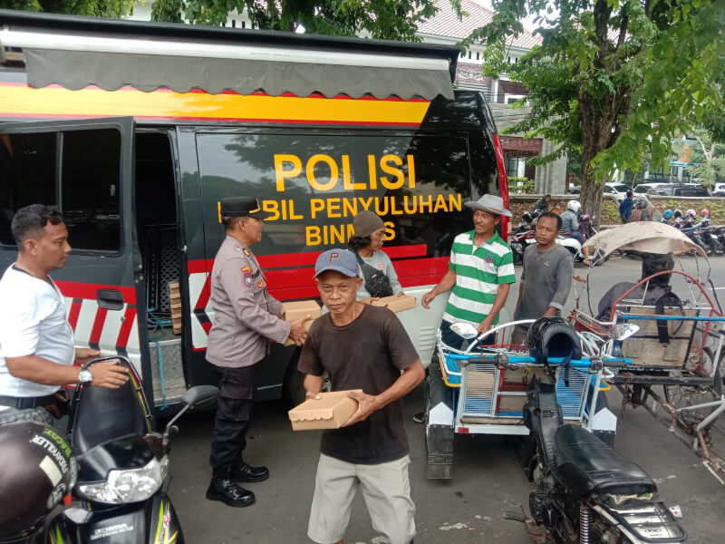 “Jadi sambil kita sampaikan himbauan kamtibmas, sekaligus berbagi nasi kotak kepada warga yang beraktifitas di jalan seperti abang becak, ojol dan juga petugas kebersihan,” tutur Kombespol Rama.