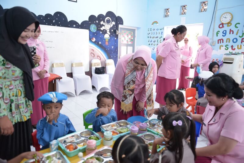 “YKB Daerah Jawa Timur berkomitmen turut mensukseskan program pemerintah yaitu pemberian makan bergizi gratis,” tutur Ny. Ade Imam Sugianto saat berbagi makanan bergizi di TK Kemala Bhayangkari 28 Situbondo.