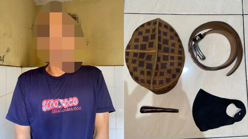 Dari tangan tersangka petugas mengamankan sejumlah barang bukti diantaranya sebuah pipa Once rokok warna coklat, celana jeans warna hitam, kaos warna biru dongker, kopyah motif warna coklat, ikat pinggang warna coklat, dan masker. Petugas juga mengamankan satu buah flashdisk berisi rekaman CCTV untuk barang bukti.