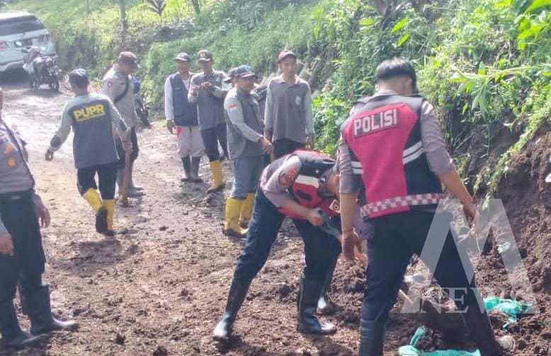 Aksi gotong royong tersebut difokuskan pada pembersihan longsoran tanah yang menutup akses jalan Dusun Sak-Sak, Desa Tiris.