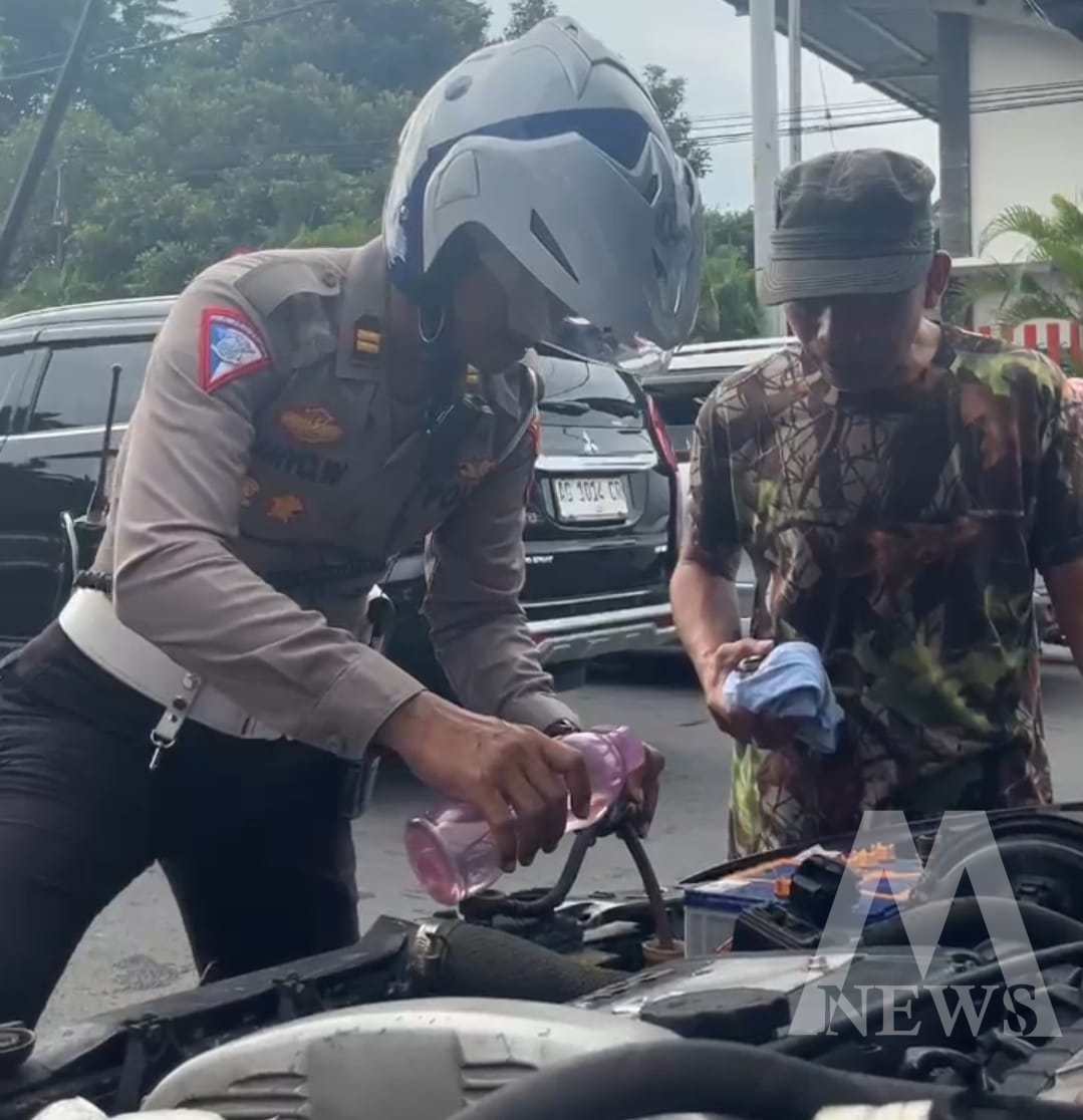 Anggota patroli lalu lintas pun memberikan bantuan servis mesin mobil demi mewujudkan mudik ceria penuh makna.
