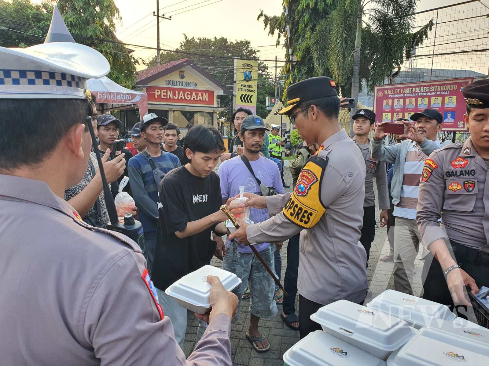 Meganews.co.id, Situbondo – Kapolres Situbondo AKBP Dwi Sumrahadi Rakhmanto, S.H., S.I.K., M.H., membagikan takjil kepada massa pengunjuk rasa dari Aliansi Masyarakat Peduli Demokrasi (AMPD) Kabupaten Situbondo.