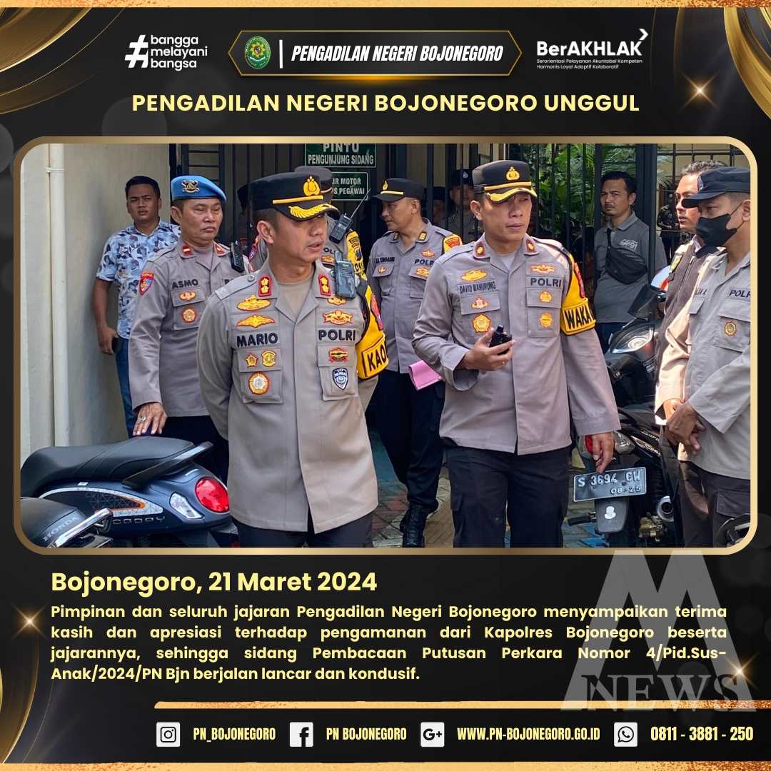 Meganews.co.id, Bojonegoro – Ketua Pengadilan Negeri (PN) Bojonegoro, Dr. Wisnu Widiastuti, S.H., M.Hum., mengapresiasi kepada Polres Bojonegoro dalam pengamanan pembacaan putusan sidang perkara Nomor : 4/Pid.Sus/2024/PN Bjn di PN Bojonegoro.