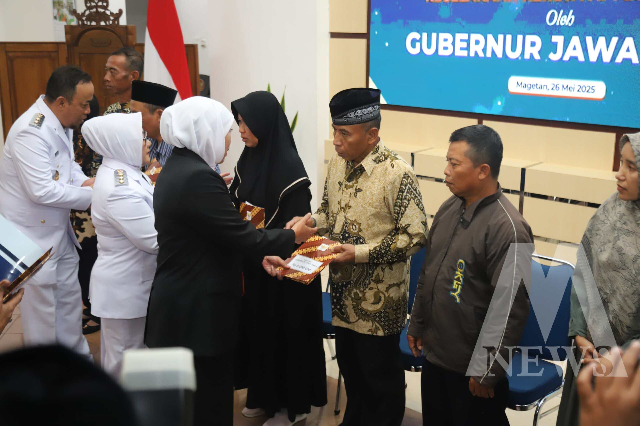 Meganews.co.id, Magetan – Forkopimda Kabupaten Magetan mendampingi Gubernur Jawa Timur Dra. Hj. Khofifah Indar Parawansa, M.Si., dalam kegiatan penyerahan santunan kepada korban kecelakaan kereta api yang terjadi di perlintasan JPL 08, Kelurahan Mangge, Kecamatan Barat, Kabupaten Magetan di Ruang Jamuan Pendopo Surya Graha, Selasa (27/05/25).