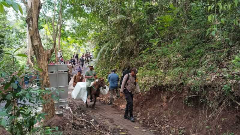 Medan yang sempit, licin, dan sulit dijangkau kendaraan bermotor memaksa para petugas menggunakan kuda sebagai alat transportasi utama mengangkut Logistik Pilkada.