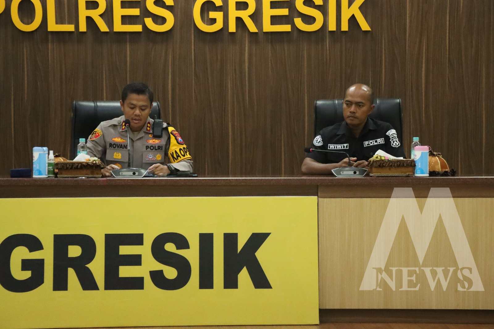 Kapolres Gresik AKBP Rovan Richard Mahenu didampingi Kasi Humas Polres Gresik AKP Wiwit