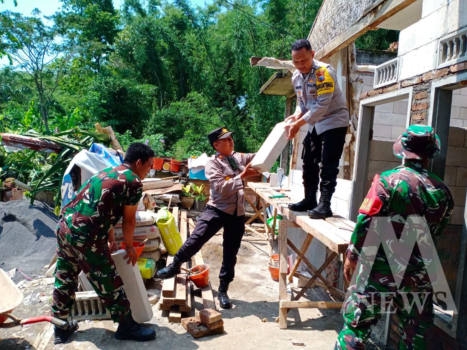 Sejumlah personel Kepolisian dan warga setempat turut bergotong royong dalam proses pembangunan.