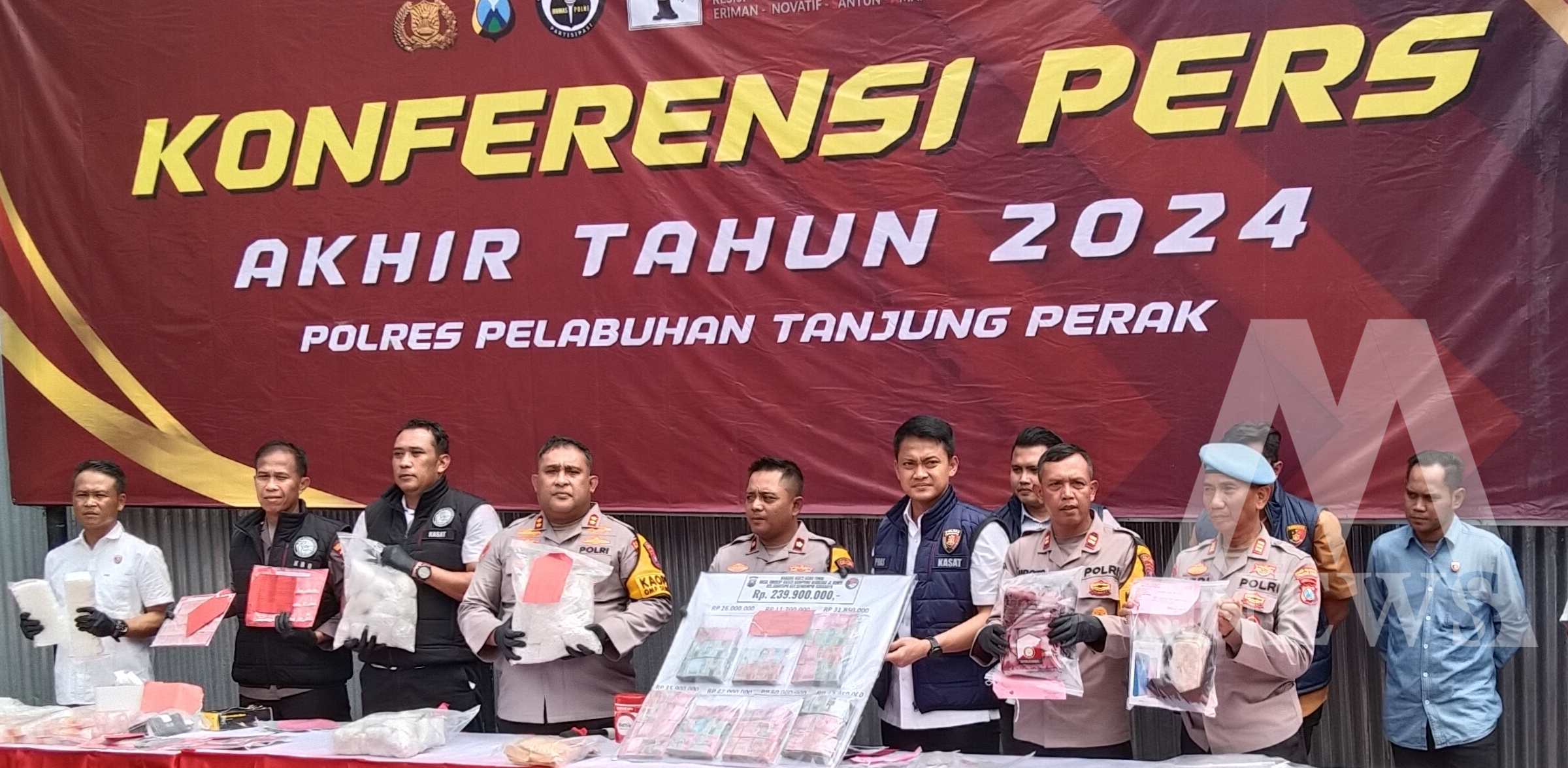 Kapolres Polres Pelabuhan Tanjung Perak AKBP William Cornelius Tanasale mengungkapkan, barang bukti yang berhasil diamankan meliputi 2.049,65 gram sabu, 1.806,93 gram Ganja, 1.066 butir ekstasi, 97.807 butir pil LL, serta uang tunai Rp. 261,8 juta.