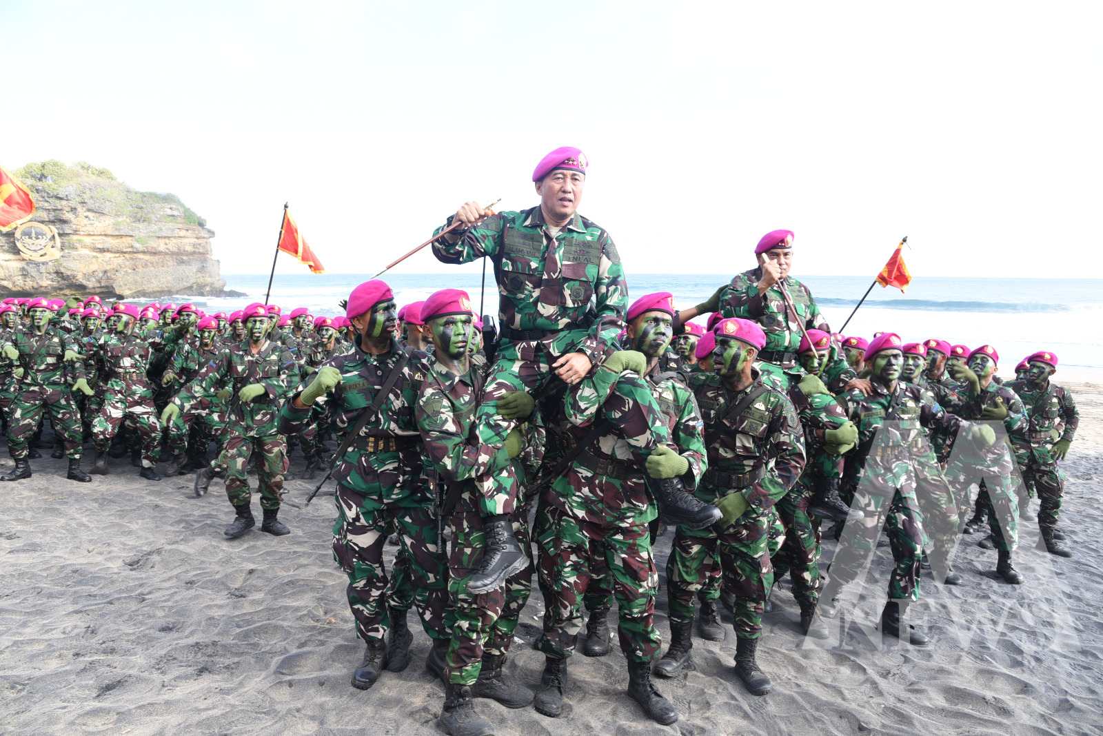 “Penyematan baret ungu sekaligus sebagai pertanda dan titik awal lahirnya prajurit-prajurit muda Korps Marinir, yang berkarakter sebagai pasukan pendarat amfibi, “first boots on the ground” yaitu pasukan paling pertama menapakkan kaki di pantai musuh melaksanakan serbuan amfibi, prajurit yang profesional, militan dan mempunyai pola pikir serta pola tindak sesuai dengan nilai-nilai luhur Korps Marinir,” tutur Dankormar.