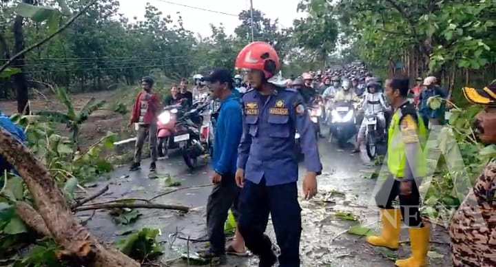 Kasi Humas, Iptu Karyoto menyampaikan bahwa di wilayahnya, pohon jenis jati tumbang dan melintang di jalan raya yang menghubungkan Dander dan Ngasem.