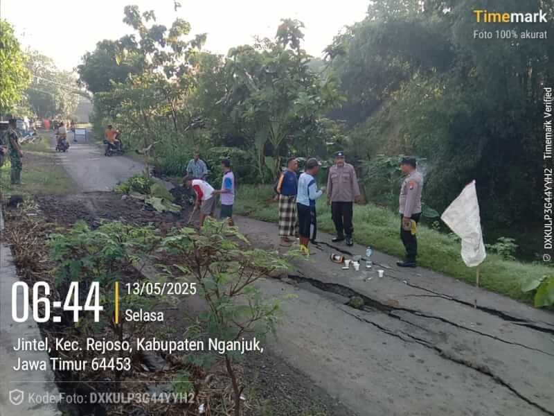 Meganews.co.id, Nganjuk – Akses jalan penghubung antar desa dilaporkan ambles akibat gerusan air yang melintasi jalan di wilayah Kecamatan Rejoso. Kejadian terjadi pada Selasa pagi, 13 Mei 2025, sekira pukul 06.00 WIB di jalan yang menghubungkan Desa Kedungpadang dan Desa Jintel, setelah hujan deras mengguyur kawasan tersebut sejak malam sebelumnya.
