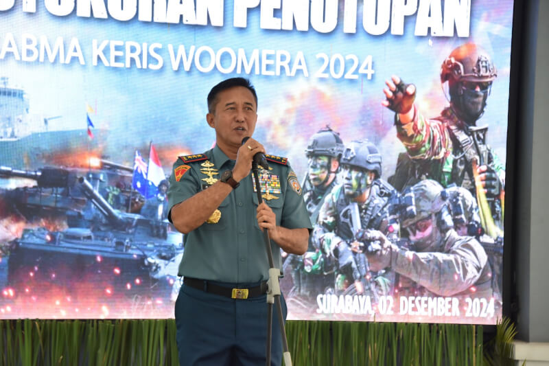 Meganews.co.id, Surabaya – Komandan Kodiklatal (Dankodiklatal) Letjen TNI Marinir Nur Alamsyah memberikan sambutan pada acara syukuran selesainya Latihan Gabungan Bersama (Latgabma) Keris Woomera 2024 yang berlangsung di Joglo Gadik Kodiklatal. Bumimoro Surabaya. Senin (02/12/24).